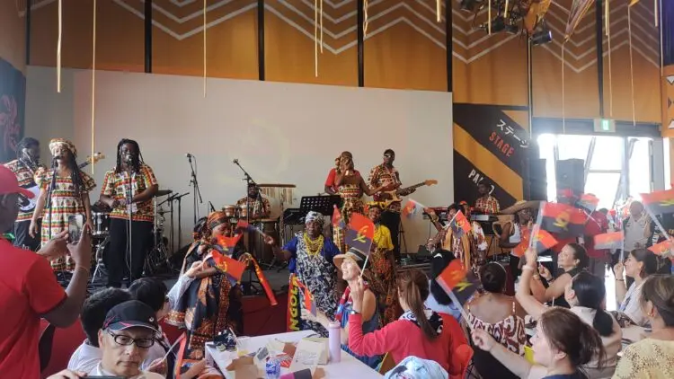 フラッと立ち寄ったアンゴラパビリオンでは、誰でも自由に入れるカフェスペースにあるステージで、「アンゴラーズ」というアンゴラ人のバンドとシンガーのグループが、ノリノリでアンゴラミュージックを演奏していた。