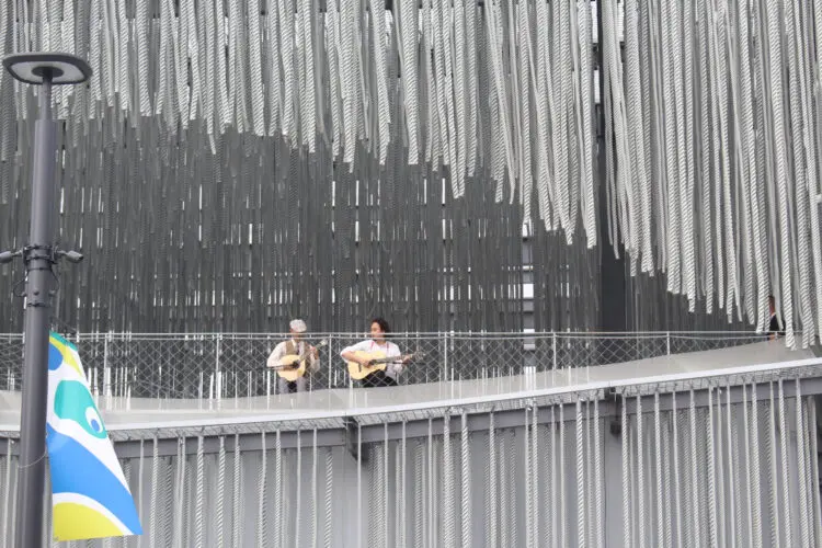 次の目的地、シャインハットへ移動中、ポルトガルパビリオンの2階に二人のギターリストが!