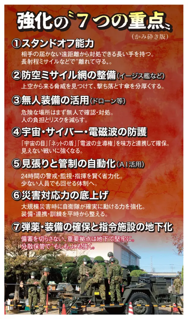 日本の防衛の土台は、「先に手を出さない。攻撃されたら反撃する」という「専守防衛」で、「防衛力抜本的強化」には前述の「スタンドオフ能力整備」など7つの重点を挙げている=表。