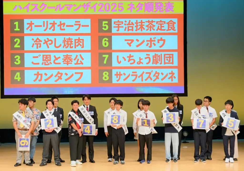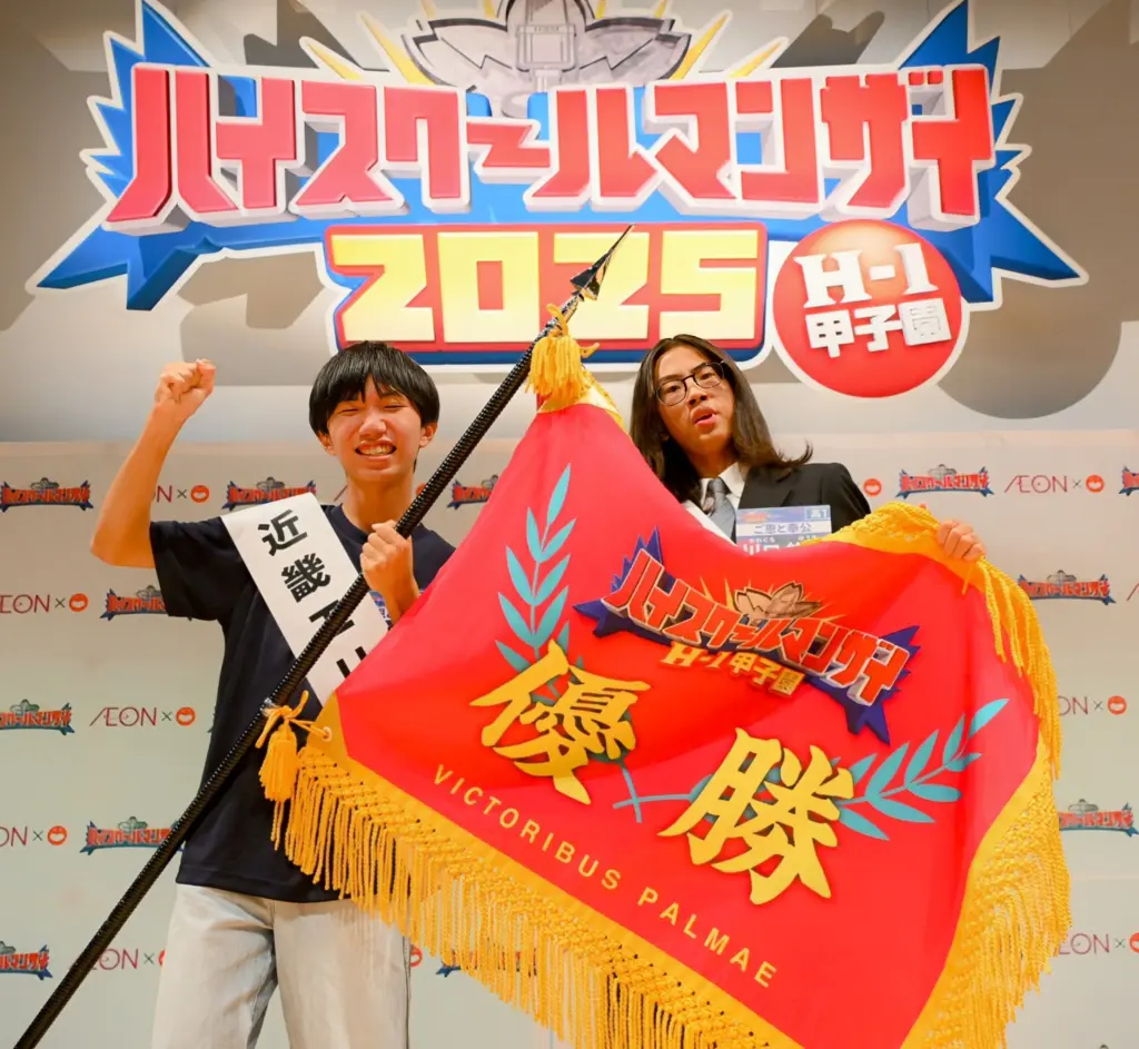 高校生漫才師の頂点決める第23回目「ハイスクールマンザイ2025H – 1甲子園」決勝大会が大阪で開かれ、870組の予選勝ち抜いた各地区代表8組が対戦。勝者は近畿エリア代表の「ご恩と奉公」で、地元の大阪府立咲くやこの花高1年、ボケ役の平山誠真(15)とツッコミ役の川口悠輝(16)の2人と決まった。