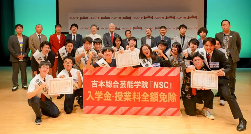 前列が入賞の3組、中列がその他の出場5組、後列は審査員と司会などの芸人