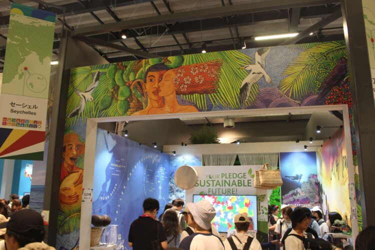 アフリカ大陸の東側に点在する115の島々からなる国セーシェルは、コモンズ館Aに出展している。「ドバイから4時間だから近いよ」とスタッフから言われたのだが、「そうですね」とは言いづらかった(笑)。