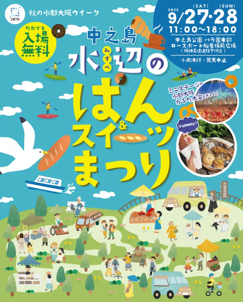 中之島公園バラ園東部、ローズポート船着場前広場(阪神高速道路下付近)で9月27、28日にグルメイベント「中之島 水辺のぱん&スイーツまつり」が開催される。関西で話題のパン屋さん、スイーツ店、合計11店舗が勢ぞろいする。