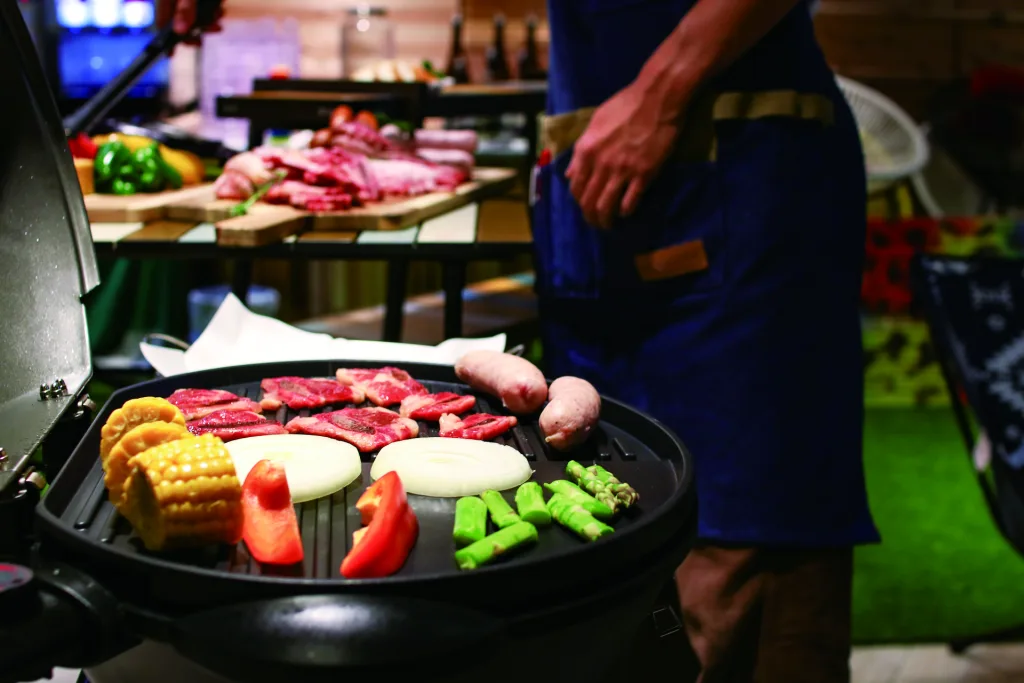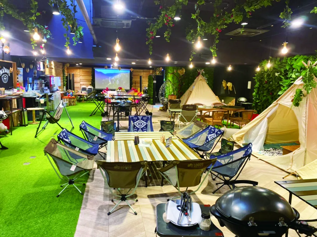 天神橋筋商店街内に全天候型BBQ施設を発見! 紫外線や雨、虫刺されのない快適空間でプチアウトドア体験ができる「NIKKA BLOCK PARK」だ。店内にはウッディな壁に芝生、テント、砂浜もあってキャンプに行った気分が味わえる。