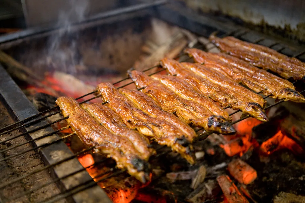 慶応三年創業、同店の“関西地焼き鰻”は鰻を腹から開き、蒸さずに備長炭で焼き上げる大阪ならではの手法だ。活きた鰻を職人の手で一尾一尾開き、金串を打ち、何度も手返しながら備長炭の強力な火力で焼き切る。「炭火焼き鰻」独特の焼き色と香ばしい香りが存分に楽しめる。