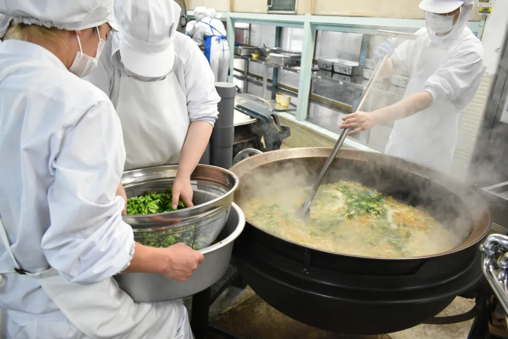 市は「安全でおいしい手作り給食・環境にやさしい給食・地域に根差した給食」を目標に、現在小学校14校、中学校6校の計約7200人の児童生徒を対象に、学校内の給食室で調理する自校調理方式を採用し、出来立ての温かい給食を提供している。