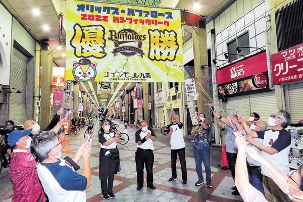 プロ野球・オリックスを応援している大阪市西区のナインモール九条商店街(渡邉聡会長)でチームのパ・リーグ2連覇を祝うアーケードバナーが掲げられた。同商店街は近鉄時代から長年、地元球団としてチームを応援している。10月2日夜、スマートフォンなどで試合を見守っていた商店街関係者が優勝確定に大喜び。バナーにつけたミニくす玉を割ったほか、クラッカーを鳴らすなどしてささやかに優勝を祝い合った。