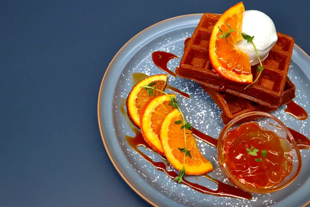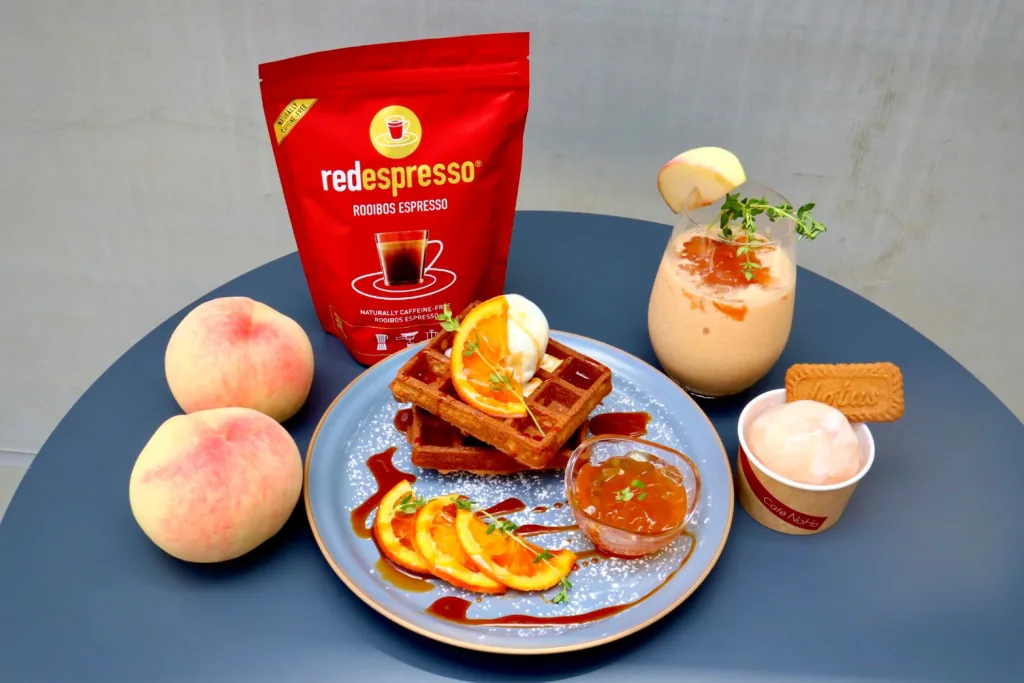 また、Red Espresso Waffle(レッドエスプレッソワッフル)=写真=は、ワッフルの生地にルイボスの茶葉を練り込み、香り高く焼き上げた。ロンネフェルトのハーブティー『ウェルネス』をぜいたくに使用したハーバルなゼリーと甘酸っぱいルイボスのソースは、ワッフルと一緒に食べることでより爽やかで、暑い時期でもさっぱりと味わうことができる。