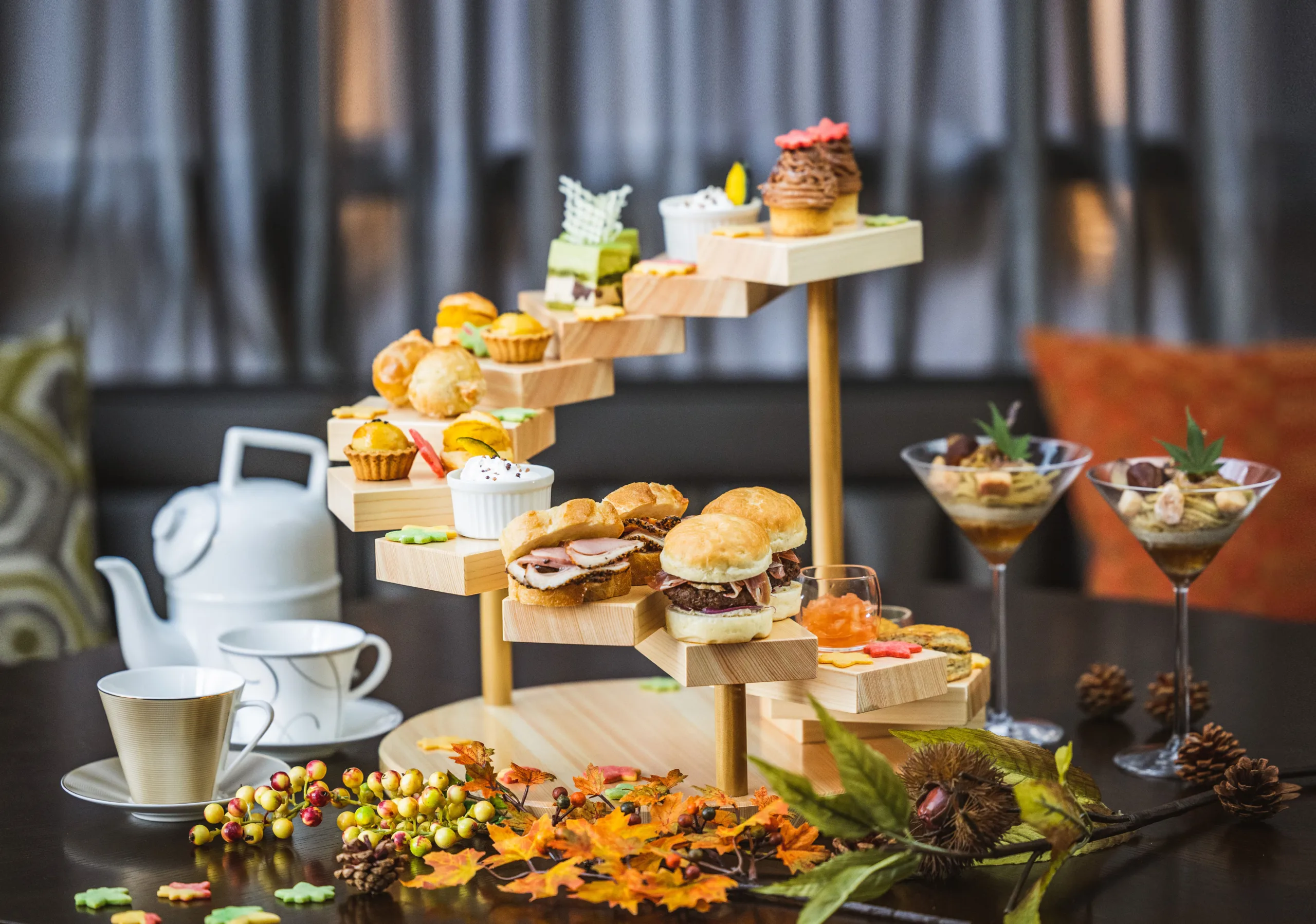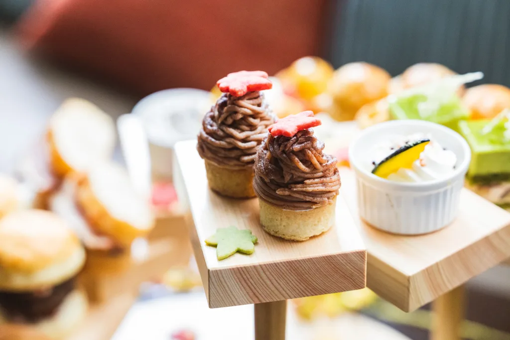 「Harvest」をテーマに華やかでかわいく盛り付けられたアフタヌーンティーは、口いっぱいに広がるラム酒の風味が楽しめるモンブランやクルミの実を中に閉じ込めたスイートポテトタルト、香り豊かなほうじ茶生クリーム、わらび餅、栗の渋皮煮が入った栗とほうじ茶のパフェ、ロンネフェルトの紅茶「アップルクランブル」の茶葉をパウダーにして練りこんだ紅茶のスコーンなど、秋にぴったりのメニューを揃える。セットのドリンクはブラックティーやハーブティーなどロンネフェルトの紅茶12種をフリードリンクで用意している。