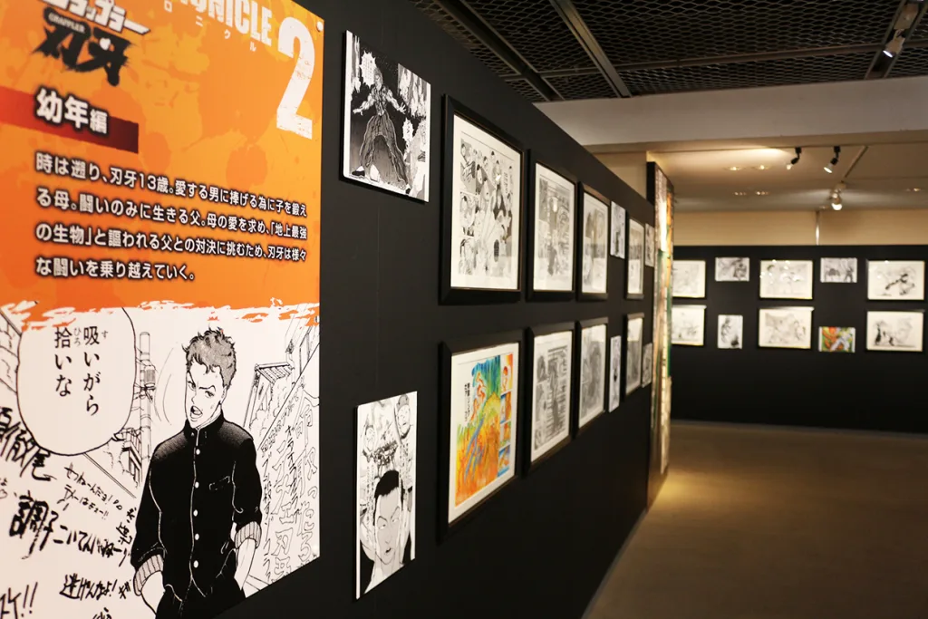 同シリーズ初の大規模展覧会で、原作者の板垣恵介さん直筆のマンガ原稿やカラー原画約180点を展示。秋田書店で板垣さんを15年担当する横井佑来さんは「1話分は20ページで構成されるが、その中で板垣先生は読者にショックを与えることを意識し、必ず見開きページで見どころを作っている。展示作品には、その板垣先生が思いを込めた見開きページばかりを集めた」と説明する。