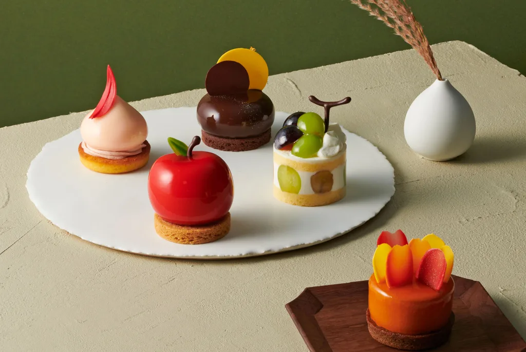 秋色に染まる木々を映した、洋梨入りのジュレとショコラキャラメルムースのケーキ「秋色(あきいろ)」や、紅玉りんごのムースとアールグレイとショコラムースで仕上げた真っ赤に実った「林檎(りんご)」など、日本の美しい秋を愛でる彩り豊かなケーキがラインナップ。秋の味わいを楽しむことができる。