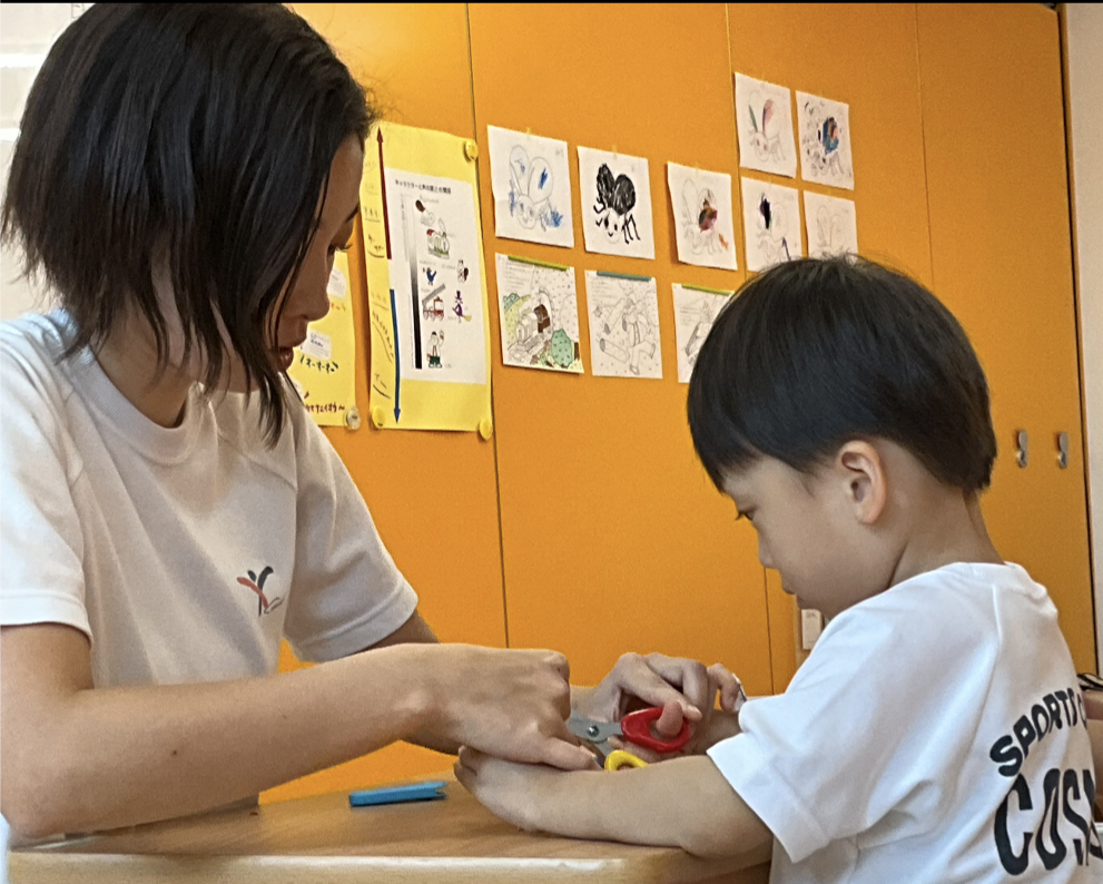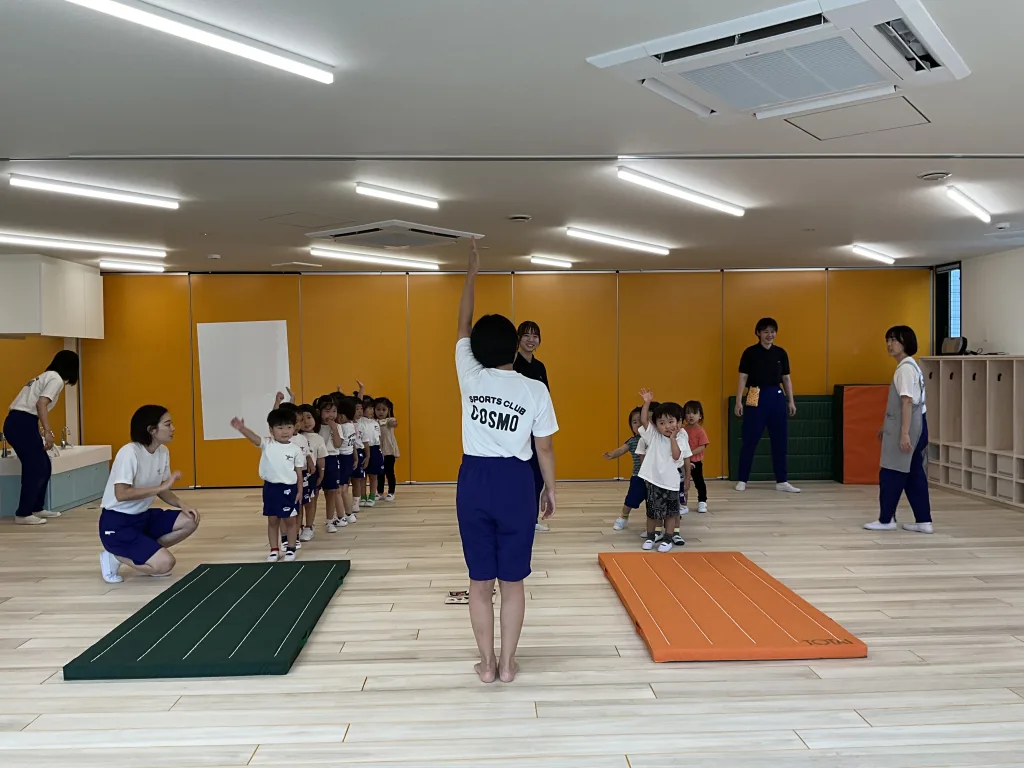 この日は敬老の日に渡すはがき作りで、はさみを使った細かな作業に取り組んでいた。小さなカーブなど難しいところは先生の補助を受けながら、みんな真剣な表情だ。次は音に合わせて歌いながら体を動かすリトミックの時間。曲の速度や高い音程など難しいことにも挑戦。上手くできなくても、先生は答えをすぐに言わない。立ち止まって「どうやったら上手くできるかな?」と考えさせるのが印象的だった。体操の時間ではマットの上をコロコロと横転する。ぶつからないように子どもたちが自ら工夫をし、自然と順番を守ることを学んでいた。
