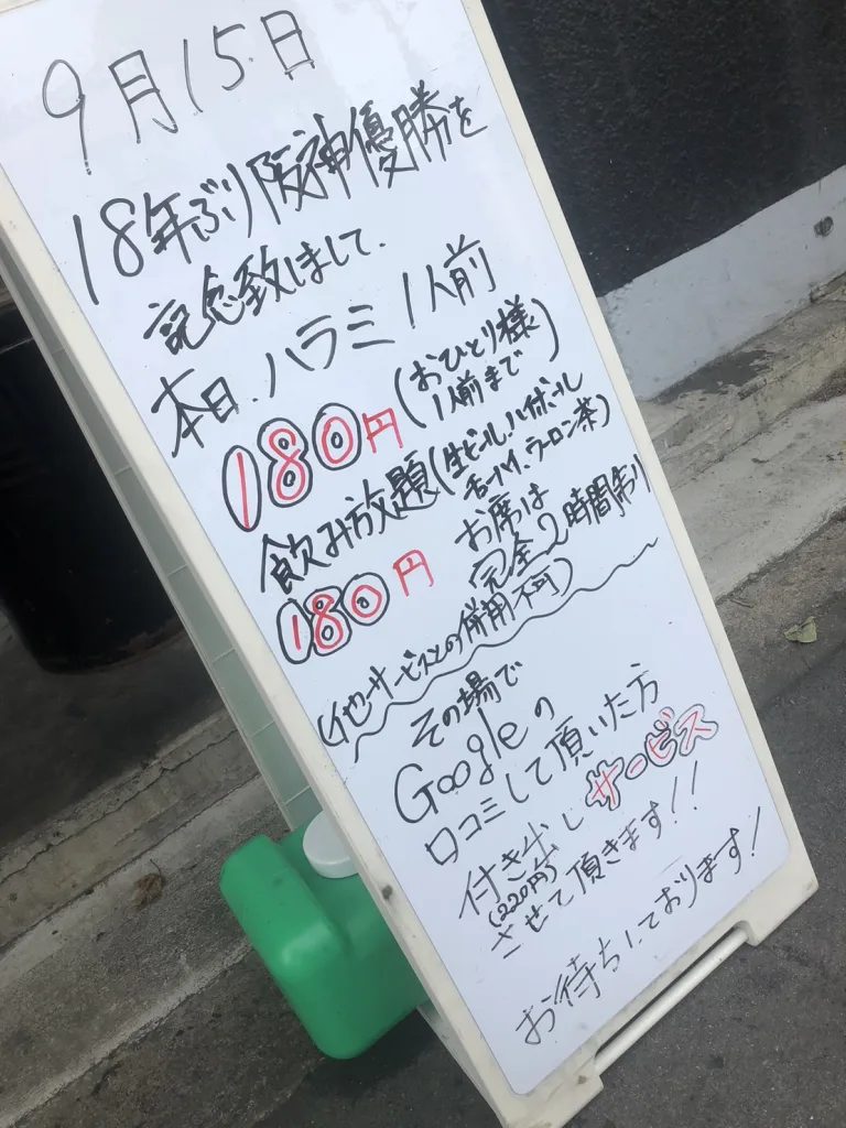 地下鉄中崎町駅出口すぎにあるドラム缶焼肉店「ソソカルビ牛天」が阪神タイガースの優勝翌日から18日間連続で、飲み放題180円を開催。18年ぶりにちなんで9月15日から18日間、1人180円で飲み放題、日替わりで180円メニュー登場と、「18」によせた内容だ。