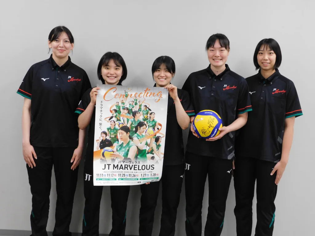 今年、新メンバーとなった成瀬選手は「高校生の時にユーチューブでJTの試合をみていました。自分が憧れの選手と一緒に試合をするのは緊張しましたが、吉原監督、選手のみんなも声を掛けてくれて適切なアドバイスをいただいています。チームに最近は馴染めてきたと思います」と笑顔で話し、井上選手も「大学のときにJTの試合を観戦していました。その当時、キャプテンでリベロだった小幡真子選手にあこがれもあり、JTで試合ができると決まったときは喜びました。実際、入ってみて想像以上に思いが高まった。応援してくださるファンの熱気を肌で感じ、これがプロなんだと実感しました。これからはJTの一員として活躍できるようにしっかり練習を頑張っていきたい」と、2人は時には笑顔を浮かべチーム愛を語った。