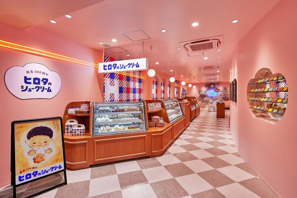 入口のカラフルなシュークリームのディスプレーや、大きなシュークリーム乗った立体看板は大阪・えびすばし店ならではのディスプレイだ。奥には大量のシュークリームモチーフでデザインされた壁などのインテリアを設置。さらに同社100周年の歴史がわかるギャラリースペースを設け、同店スタッフは「昔のヒロタを知っている大阪人にとっては懐かしく、ヒロタを初めて知る人にもレトロかわいい店内です」と話していた。
