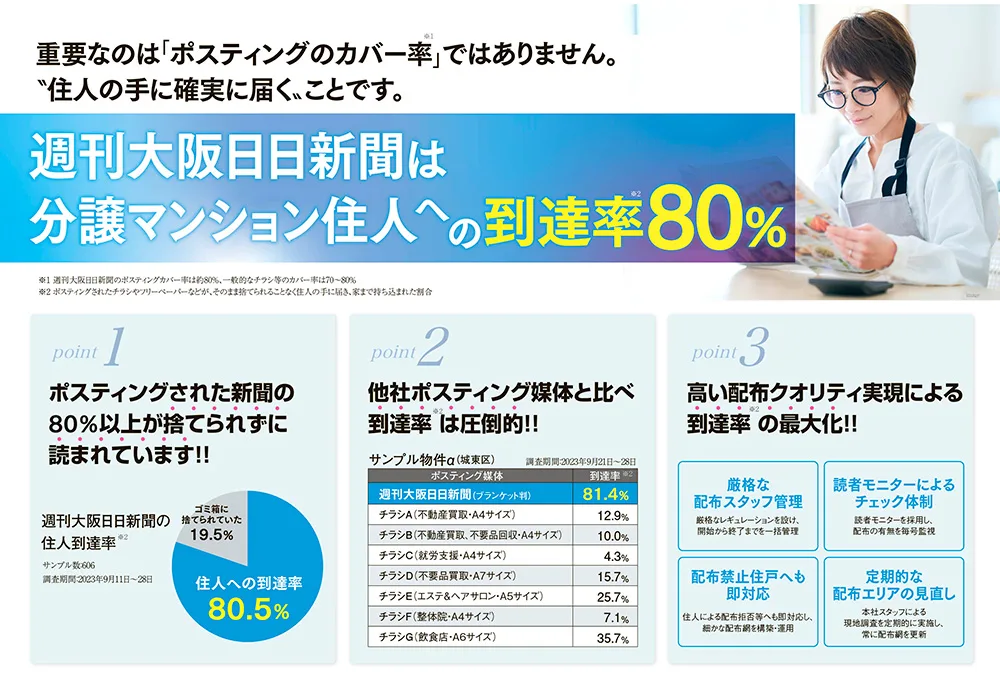 マンションなど集合住宅のポスト下にあるゴミ箱から、不本意ながら捨てられている数を逆算して到達率を集計しています(定期的に調査し紙面向上に役立ています)。到達率は自治体広報紙と同等の8割程度となっています。