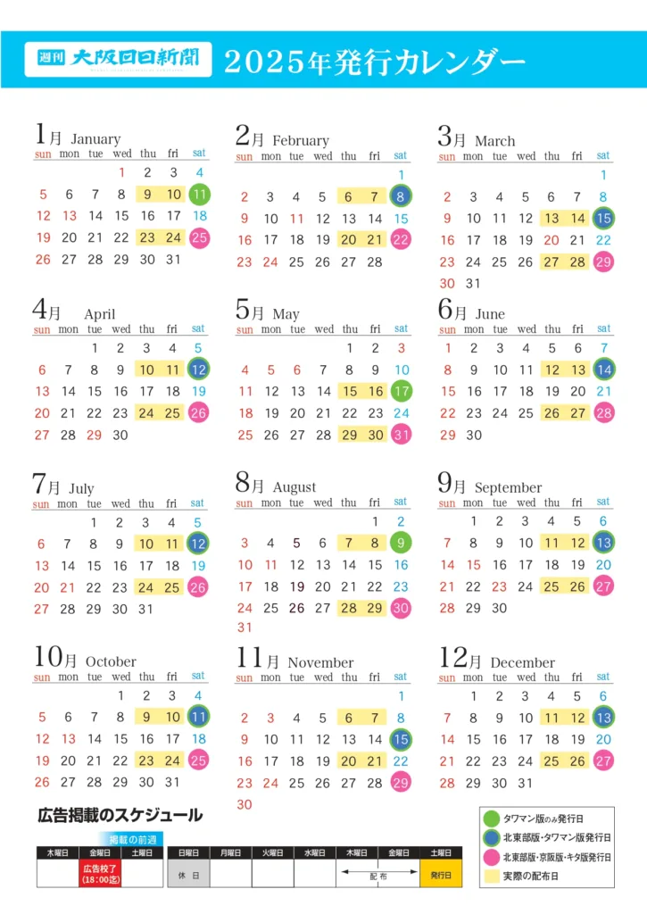 発行は、第2・4土曜(版によって発行回数が異なります)。版は「キタ版」「北東部版」「京阪版」と、3つのエリアに分けて発行しています。配布日や原稿校了日などのスケジュールも確認できます。